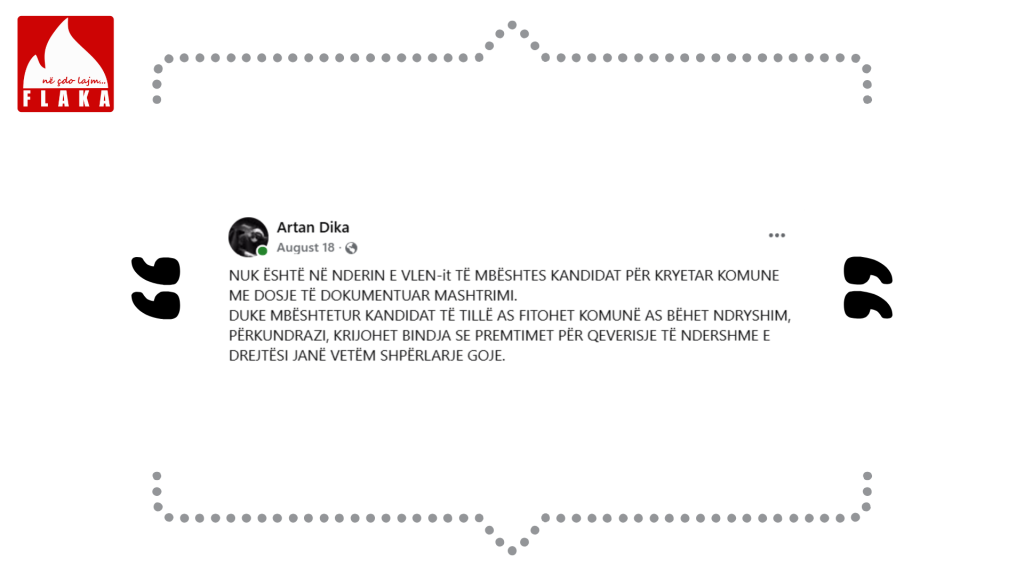 Akuzat e ngritura nga Artan Dika dhe dëshmia e biznesmenit nga Tetova hedhin hije të rënda mbi imazhin e kandidatit të VLEN-it për Komunën e Strugës. Redaksia “Flaka” është në pritje të reagimit të z. Mendi Qyra mbi këto denoncime.Gazeta Flaka