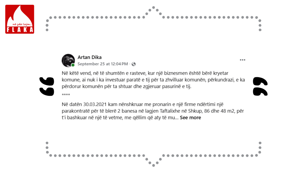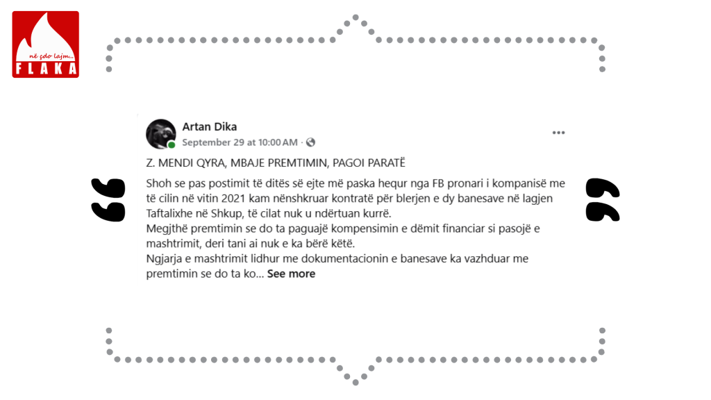 “Megjithë premtimin se do ta paguajë kompensimin e dëmit financiar si pasojë e mashtrimit, deri tani ai nuk e ka bërë këtë. Premtimet e rrejshme dhe zvarritjet pafund e kanë bërë të pamundur zgjidhjen e rastit,” – shkruan Dika.