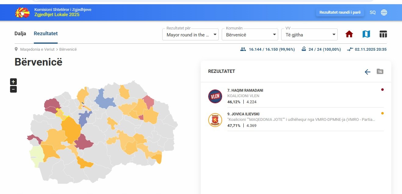 Pas përfundimit të numërimit të 100% të votave në zgjedhjet lokale të Bërvenicës, kandidati Jovica Ilievski është shpallur fitues i garës, duke mposhtur Haqim Ramadanin me një diferencë të ngushtë. Rezultatet përfundimtare tregojnë se Ilievski ka marrë 4.369 vota, ndërsa Ramadani ka grumbulluar 4.224 vota.